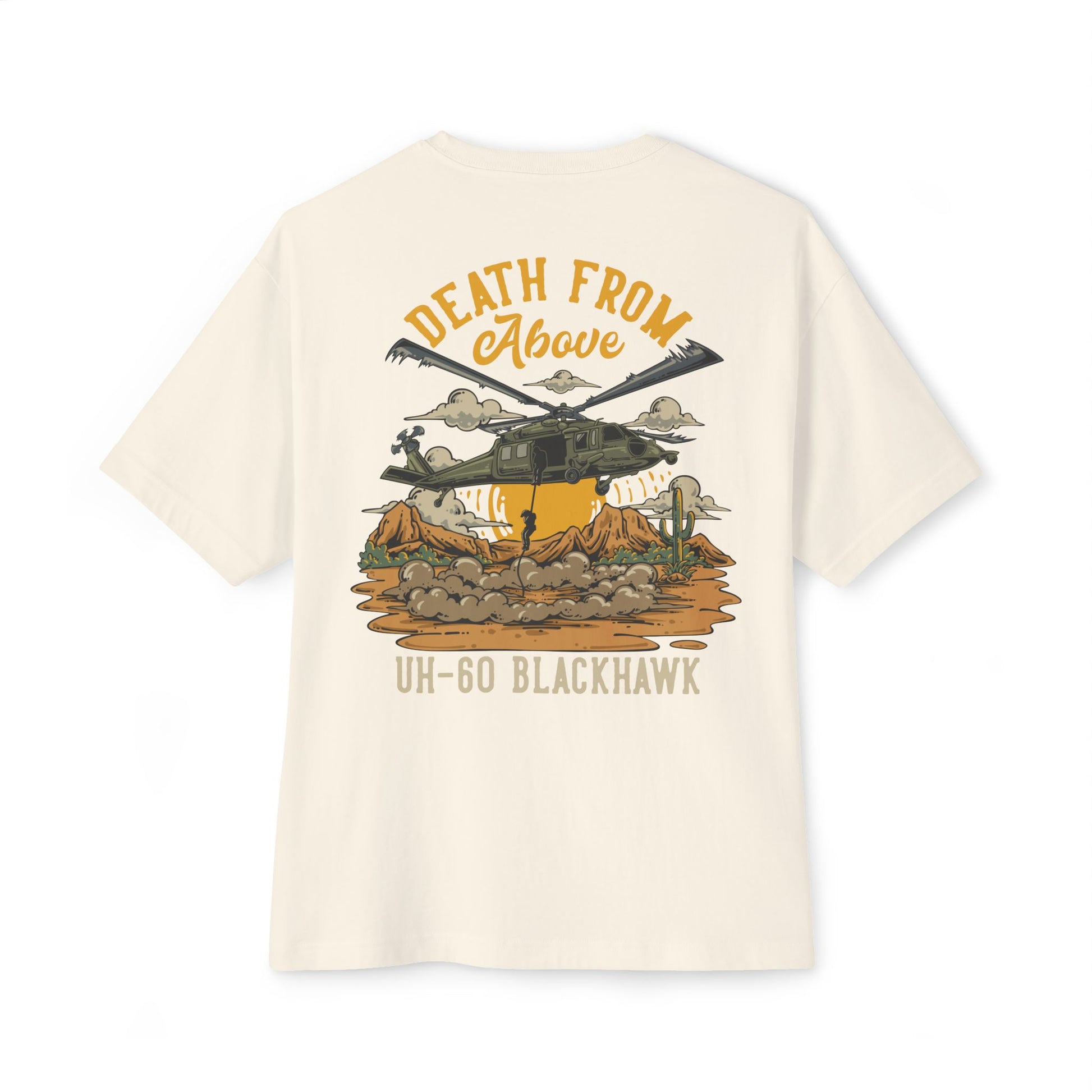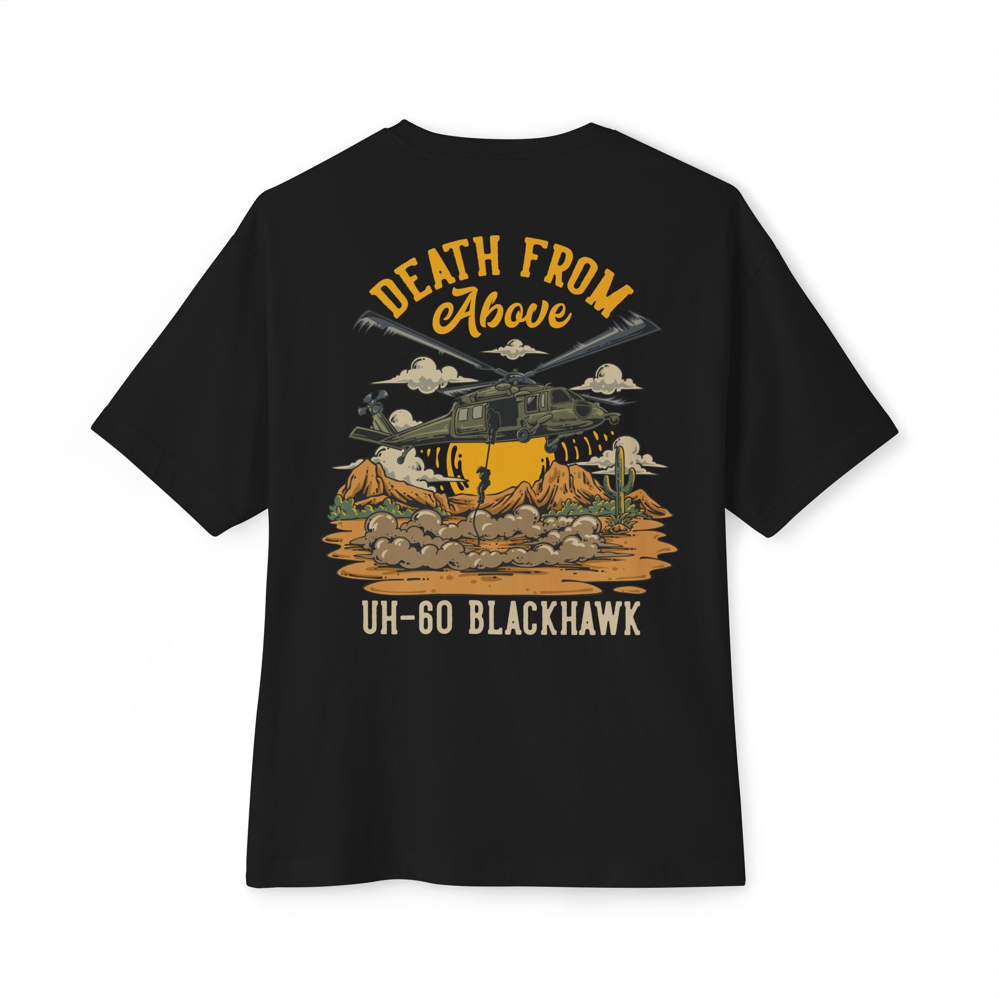 Honor the power, precision, and versatility of the UH-60 Blackhawk with this bold “Death From Above” T-shirt. A mainstay of U.S. military operations since the late 1970s, the Blackhawk has served as a lifeline for troops in combat zones—delivering soldiers, evacuating the wounded, and dominating the skies in both peace and war. This striking design captures the helicopter in a dramatic fast-rope insertion against a rugged desert backdrop, symbolizing its unmatched ability to bring the fight wherever it’s needed most.